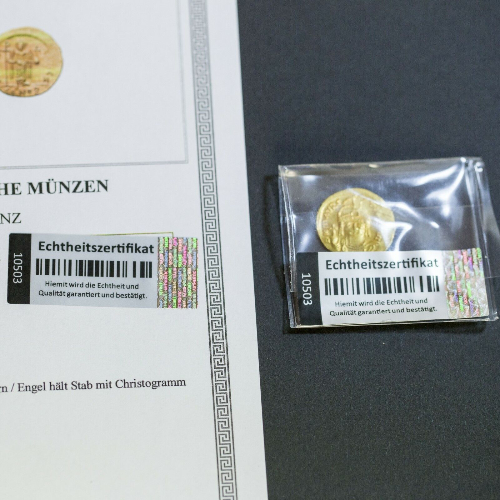 Achtung: Sie erhalten nur die Aufkleber mit Hologrammstreifen, wie auf Bild 1 gezeigt nicht das ausgedruckte Zertifikat und die Münze, dies soll nur ein Anwendungsbeispiel geben.