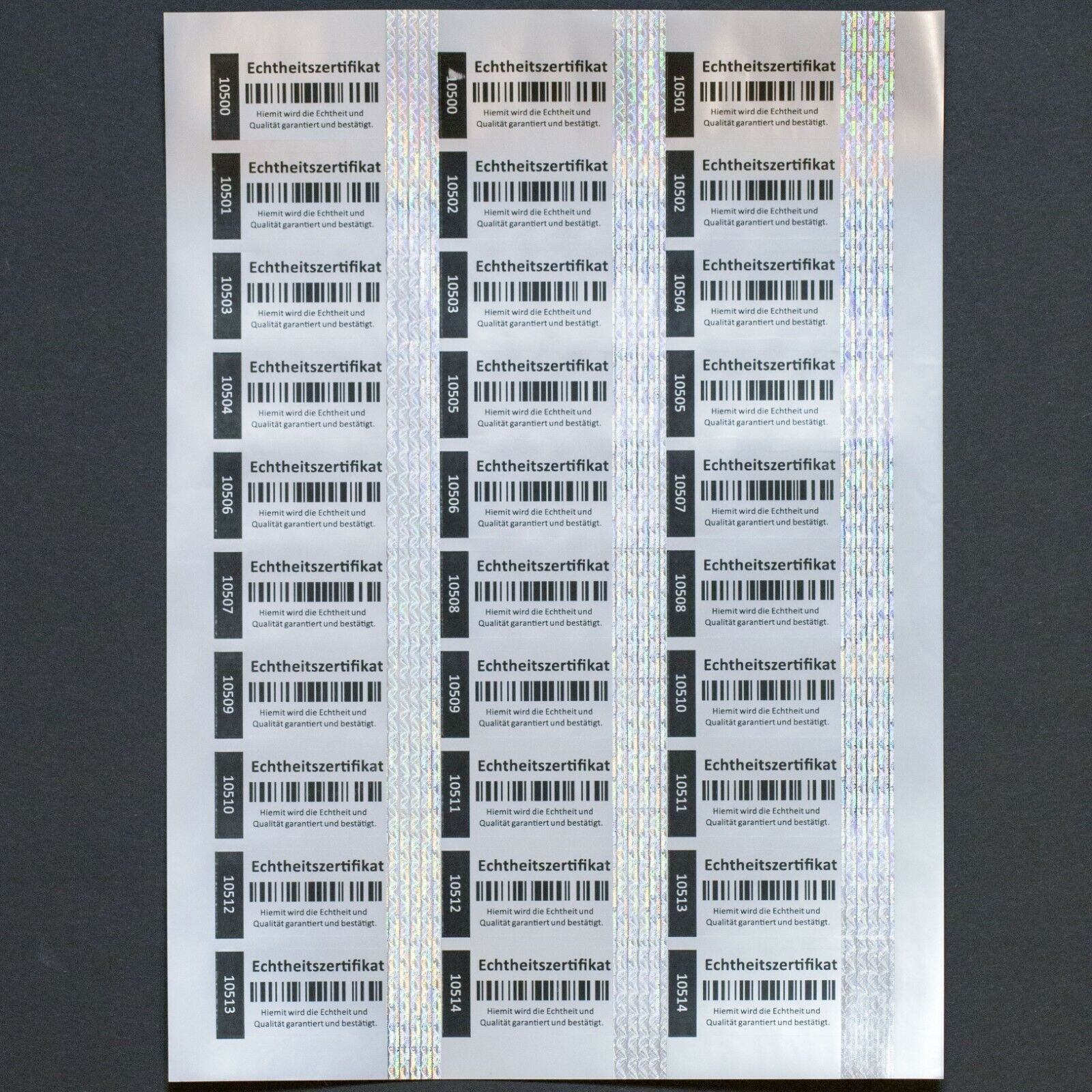 Echtheitszertifikat 5x2 cm mit Hologramm und Seriennummer