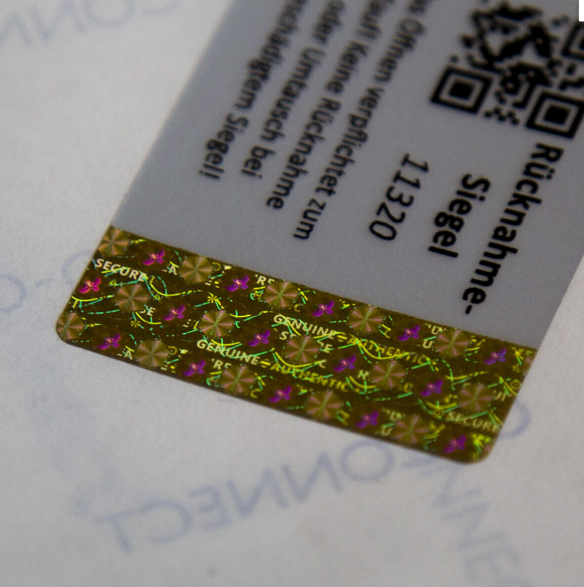Im Hologramm-Steifen sind die Wörter "Sicher, Genuine, Valid, Authentic, Original,