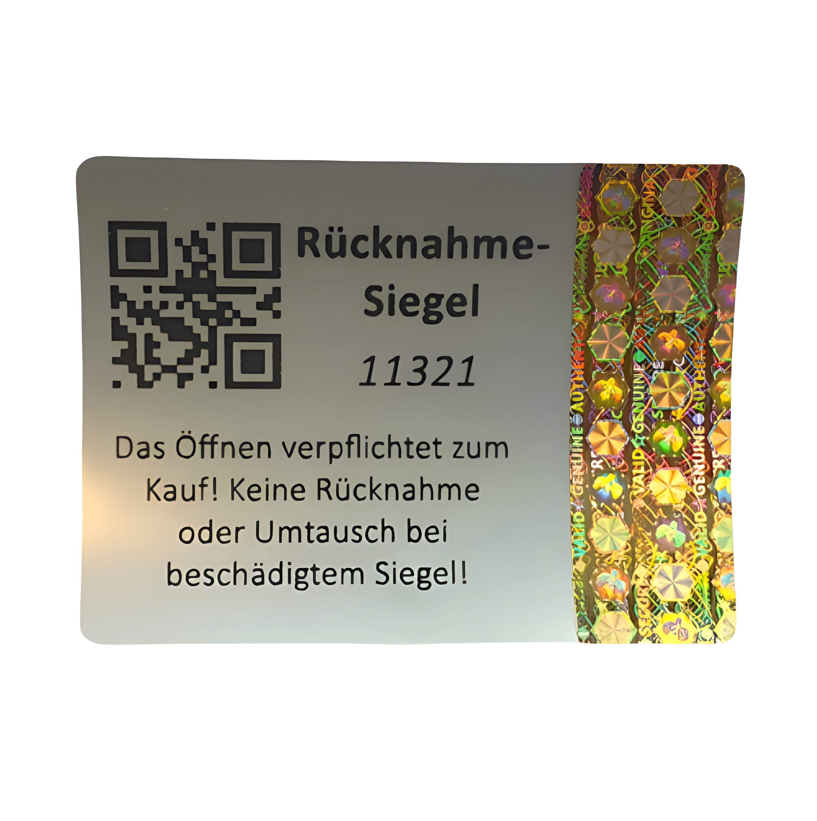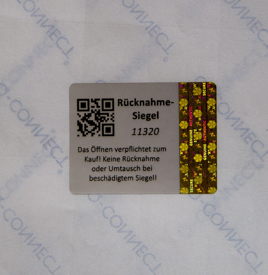 Text: "Rücknahme-Siegel" "Das Öffnen verpflichtet zum Kauf! Keine Rücknahme oder Umtausch bei beschädigtem Siegel!"