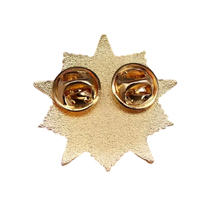 - Befestigung: Zwei stabile Steckverschlüsse auf der Rückseite garantieren einen bombenfesten Halt und verhindern, dass sich der Pin an der Kleidung verdreht.