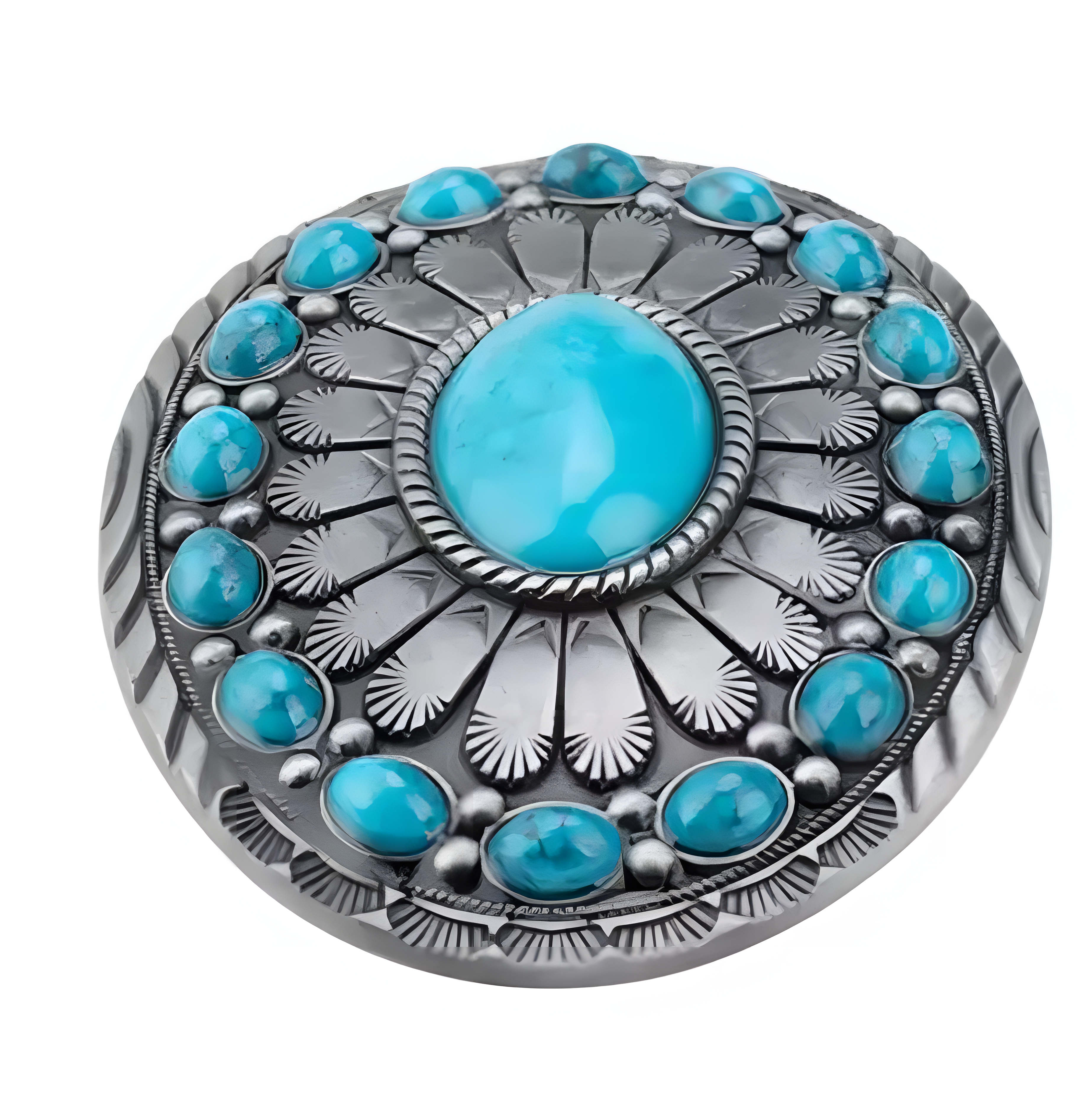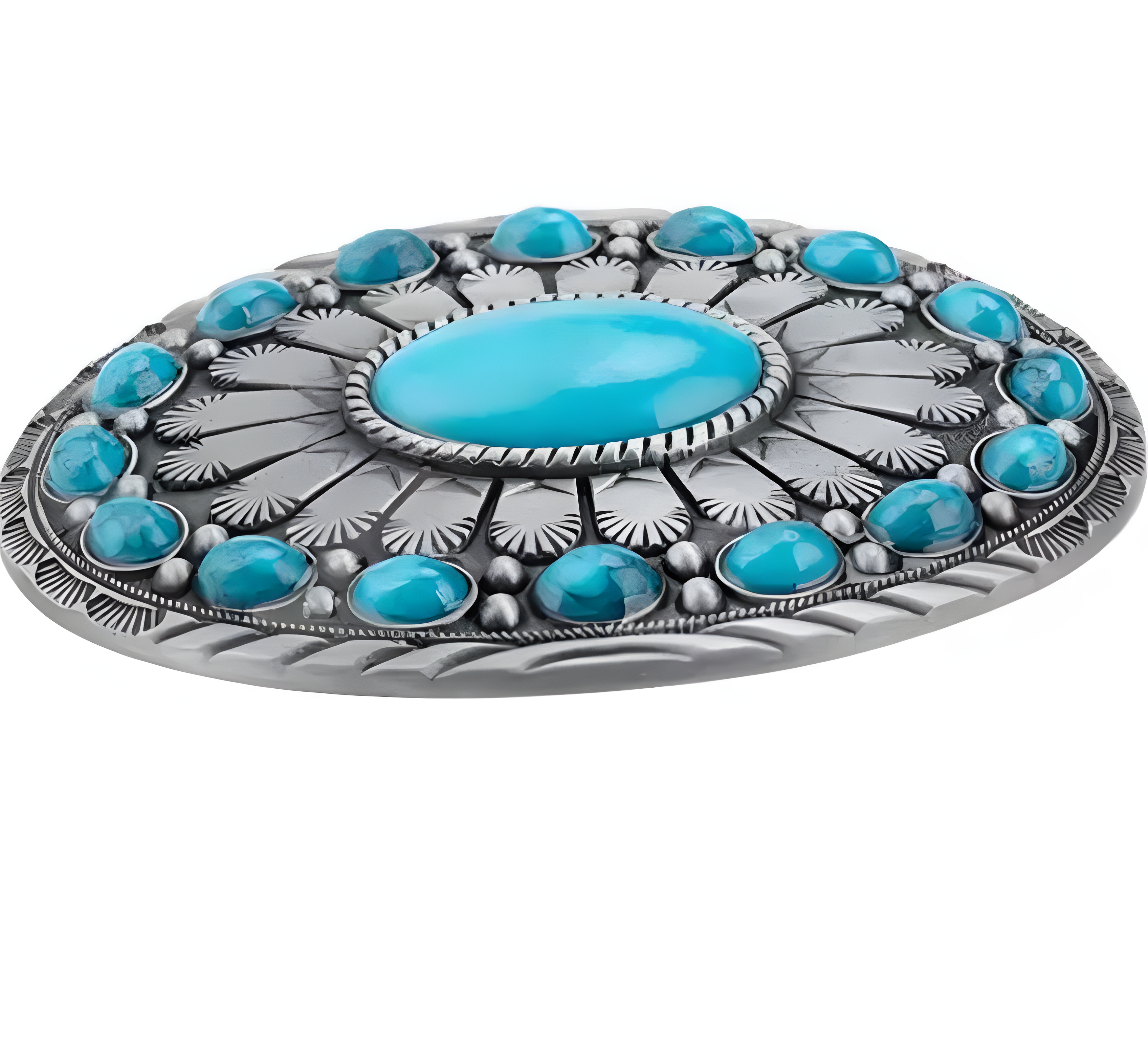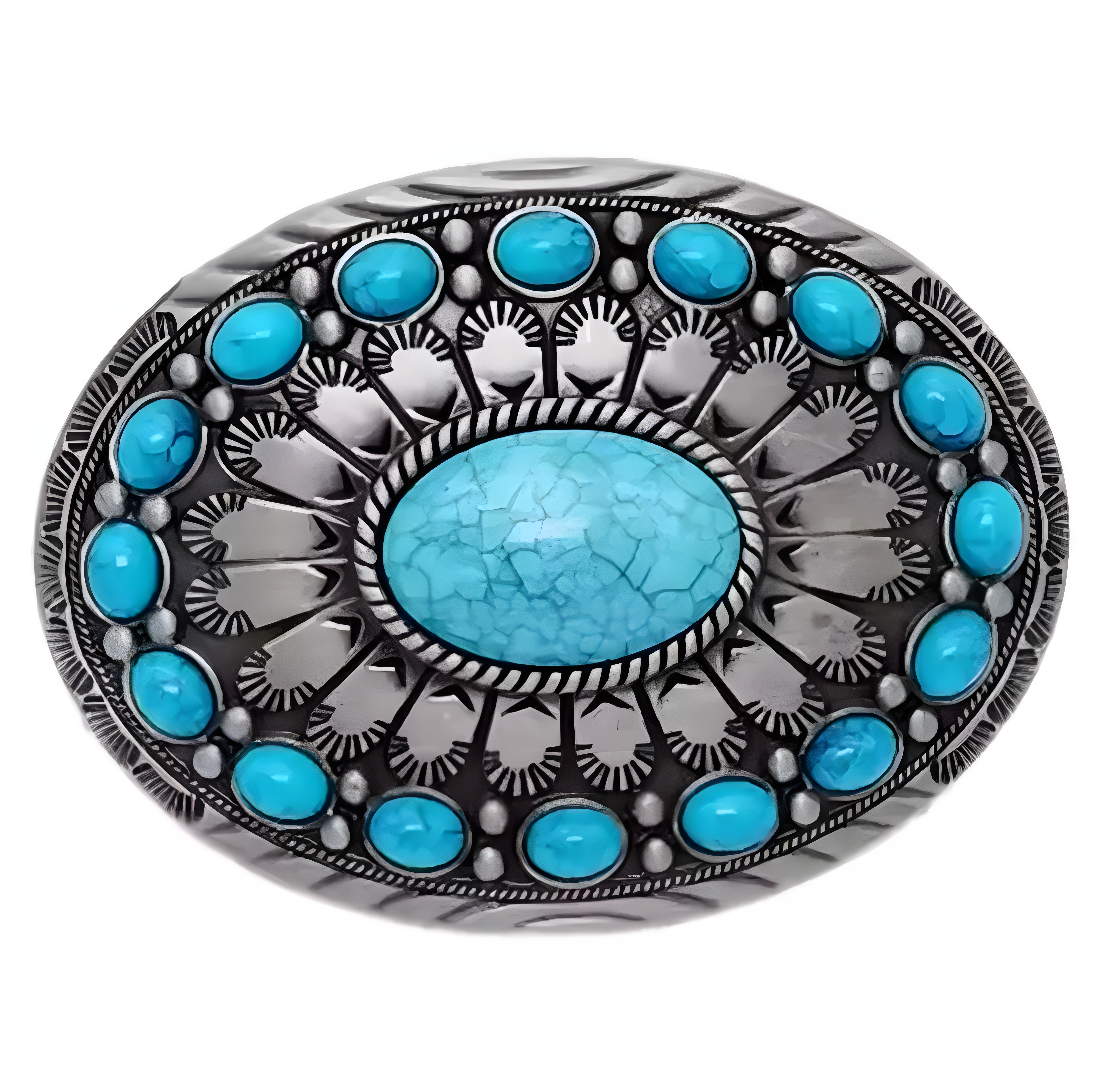 Verleihen Sie Ihrem Gürtel einen authentischen Western-Look. Diese detailreich gearbeitete Wechselschnalle besticht durch ihre klassische ovale Form und den kontrastreichen Besatz mit türkisfarbenen Steinen in verschiedenen Größen.