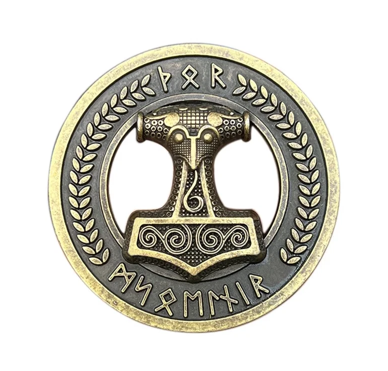 - Runenschrift: Am oberen Rand befindet sich die Runen-Folge für „THOR“, während am unteren Rand der Name „MJÖLNIR“ in Runen eingeprägt ist.