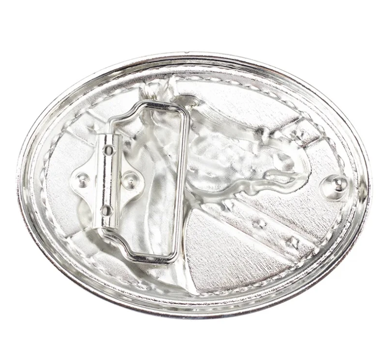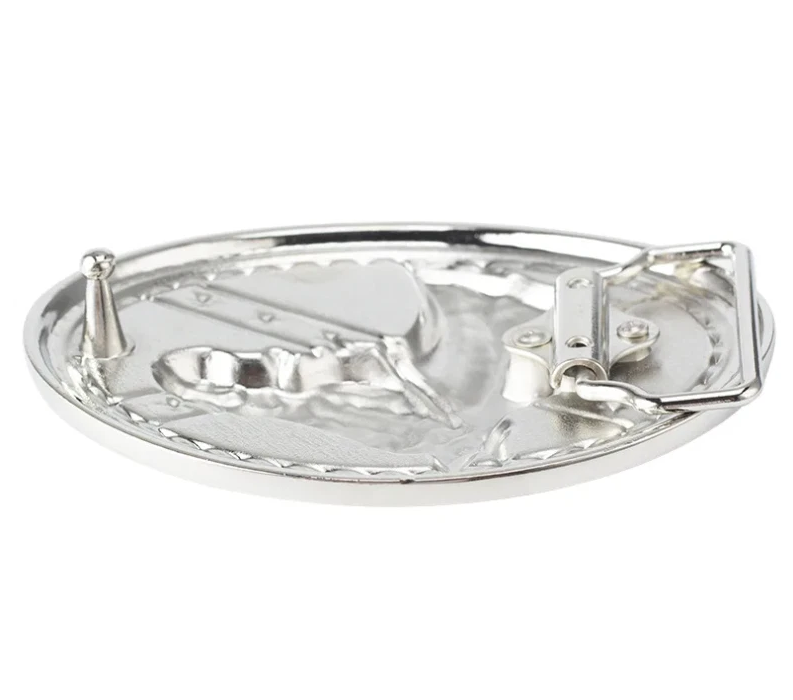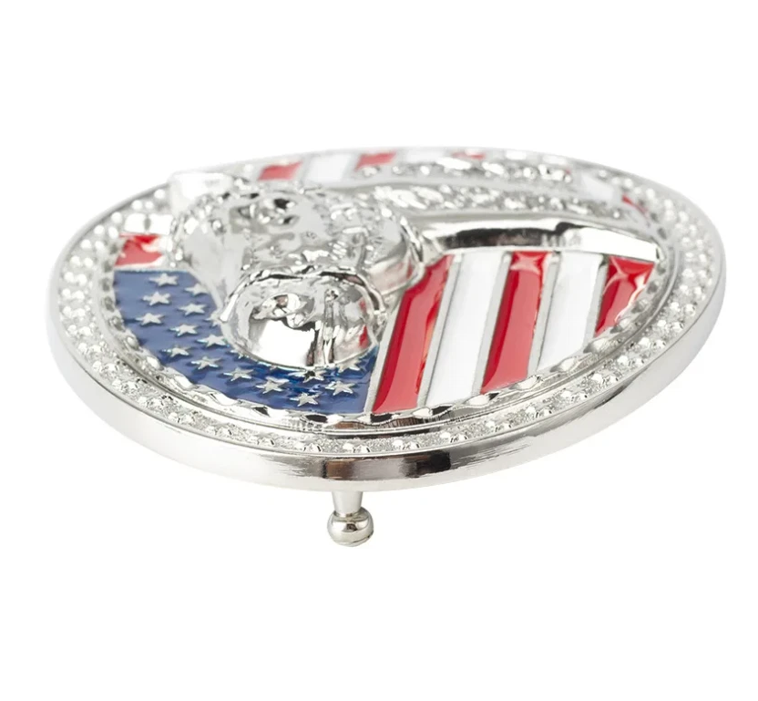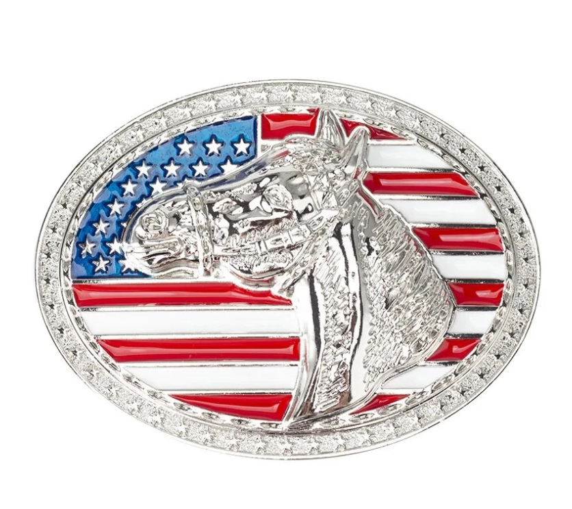 Ein glanzvolles Statement für Western-Fans, Reiter und Patrioten. Diese hochwertige Wechselschnalle kombiniert die Anmut eines Pferdes mit den ikonischen Farben der USA. Der detailreiche Pferdekopf im Profil hebt sich brillant von der leuchtenden US-Flagge im Hintergrund ab und wird von einem prachtvollen Sternen-Rahmen eingefasst.