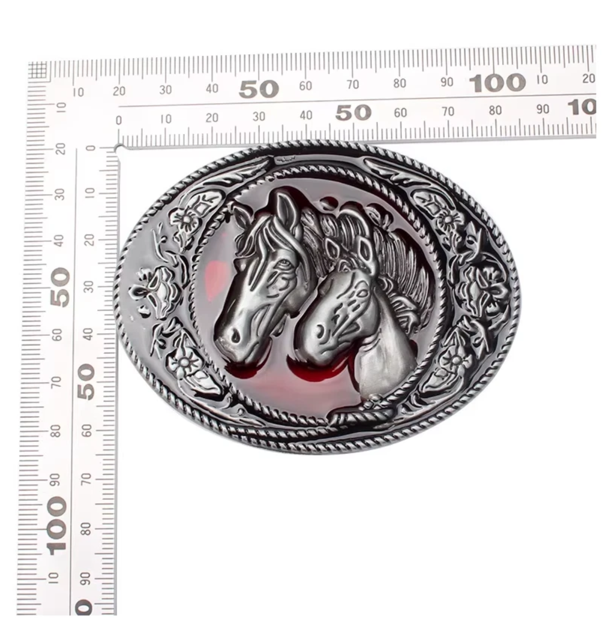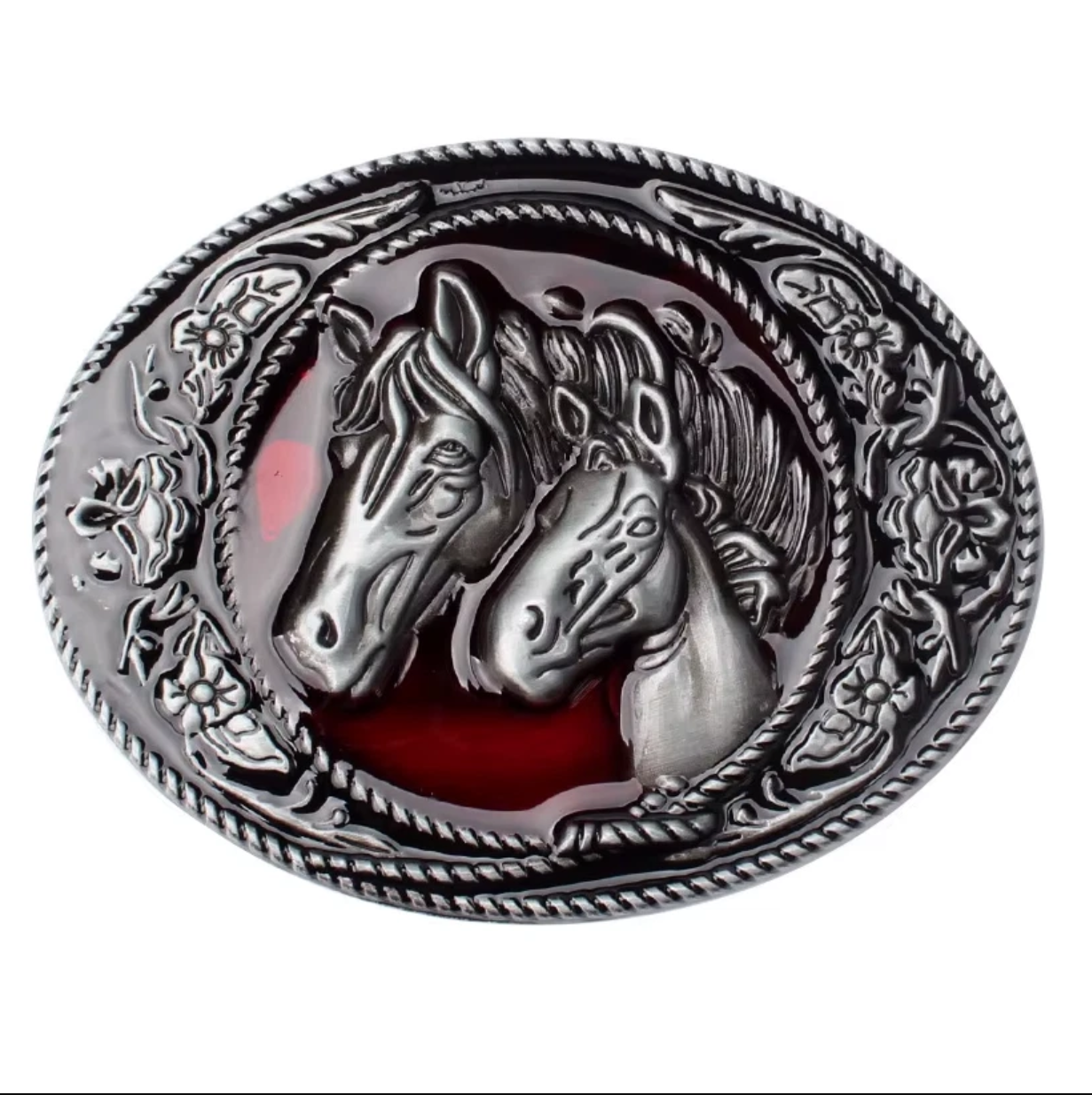 Ein wunderschönes Accessoire für alle Reiter, Pferde-Liebhaber und Western-Fans. Diese ovale Wechselschnalle besticht durch das detailliert ausgearbeitete Relief zweier Pferdeköpfe, die sich harmonisch vor einem tiefroten, glänzenden Hintergrund abheben.