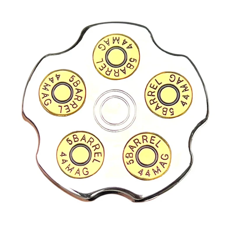 - Motiv: Authentische Revolvertrommel mit fünf sichtbaren Patronenböden.