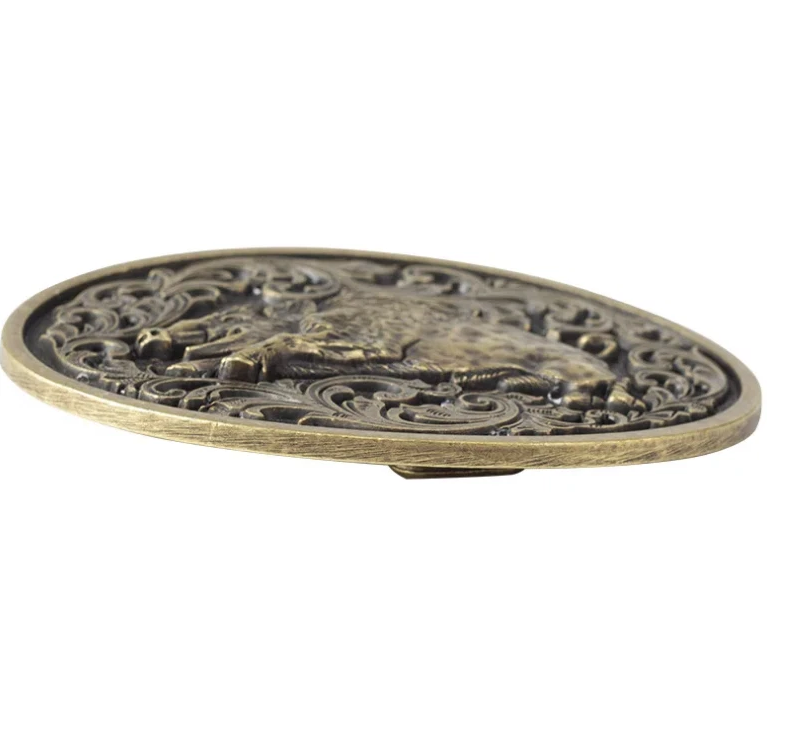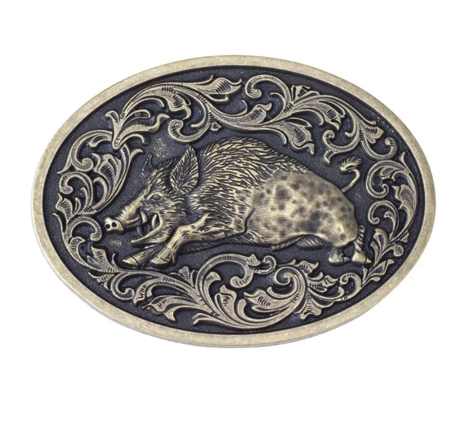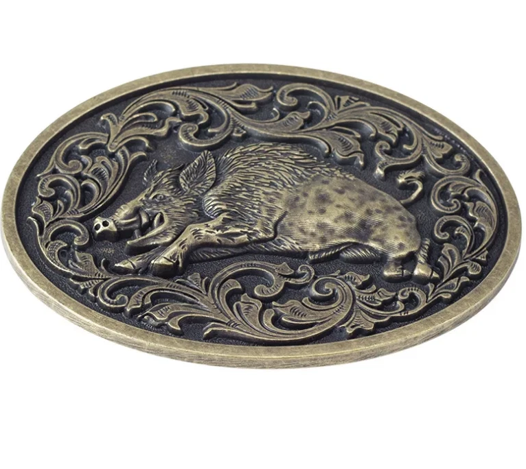 Ein unverzichtbares Accessoire für Jäger, Förster und Liebhaber von traditioneller Trachtenmode. Diese schwere Wechselschnalle zeigt einen imposanten Keiler (Wildschwein) im vollen Lauf, eingebettet in ein kunstvolles Arrangement aus klassischen floralen Ornamenten. Die rustikale Antik-Bronze-Optik verleiht dem Buckle einen zeitlosen Charakter, der perfekt zu Ledergürteln in Braun oder Schwarz passt.