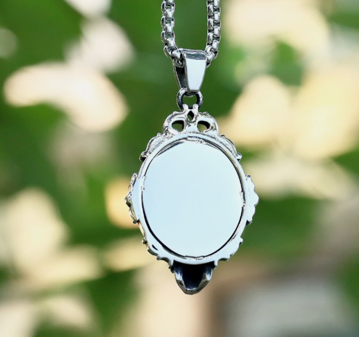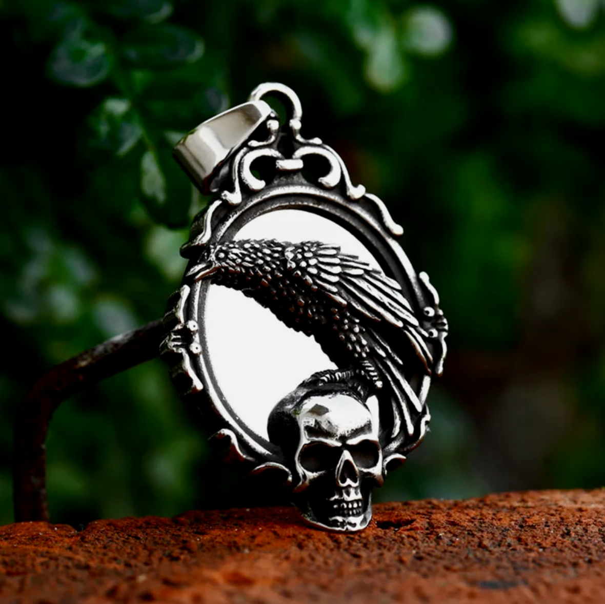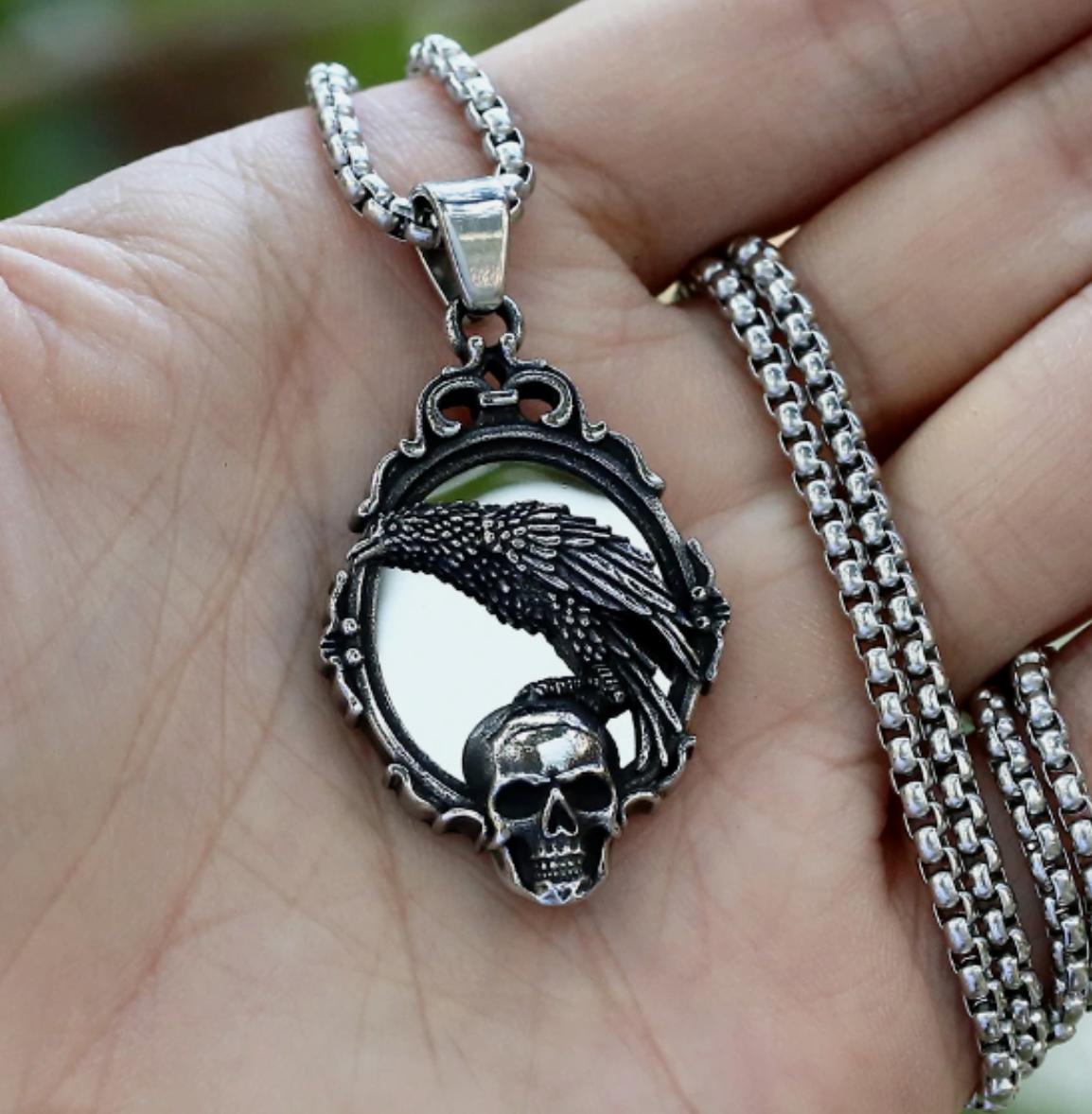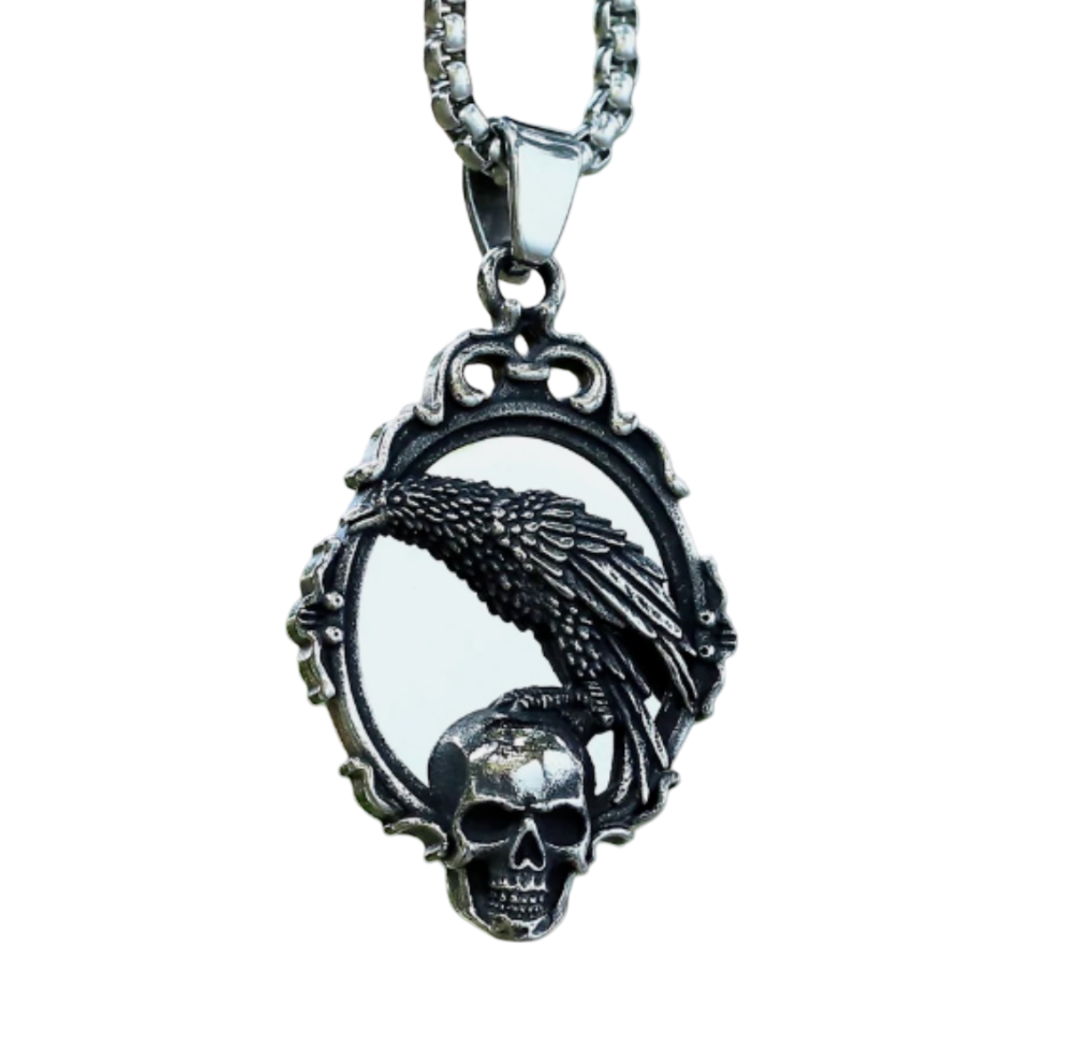 Halskette Spiegel mit Totenkopf und Rabe Silber 60 cm