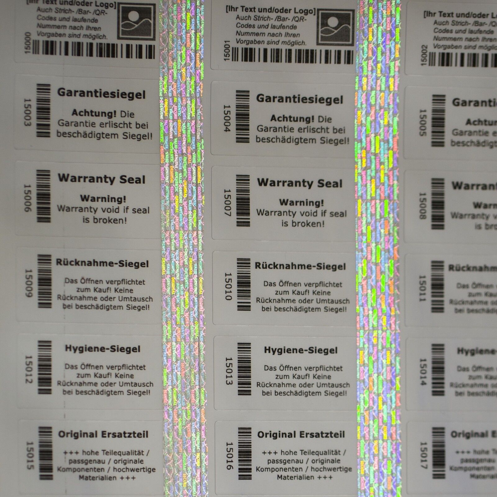 Sichern Sie Ihre Produkte und Gewährleistungsansprüche mit diesem auffälligen, großformatigen Warranty-Hologrammsiegel inklusive Barcode und fortlaufender Seriennummer für maximale Sicherheit.
