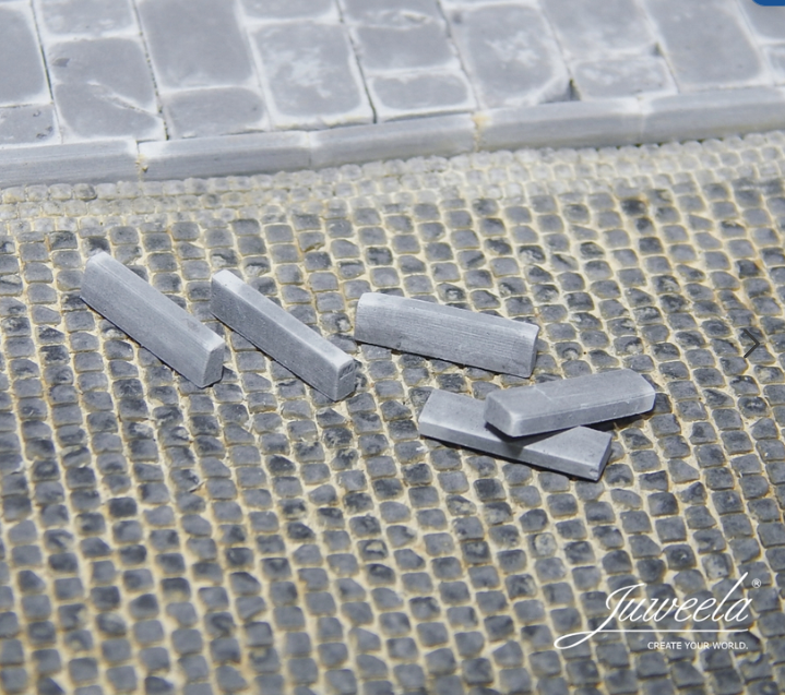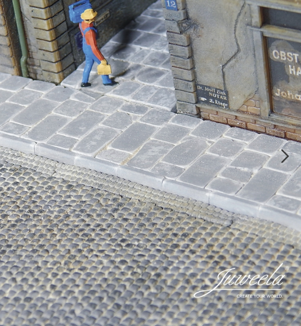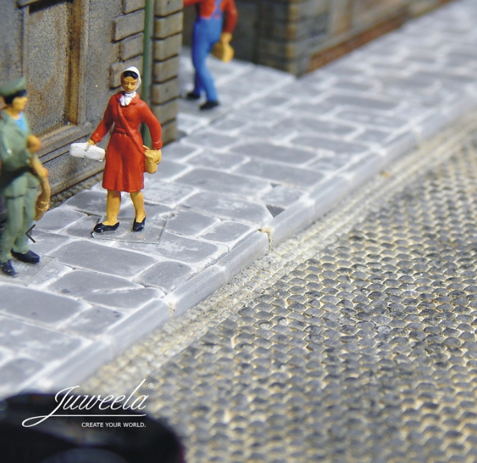 Beliebig kombinierbar und individuell mit den Bürgersteigplatten und Bordstein Ergänzungen erweiterbar. Ein nachträgliches Bemalen ist mit jeder Farbe möglich; ebenso lassen sie sich problemlos bearbeiten (schleifen, sägen etc.)