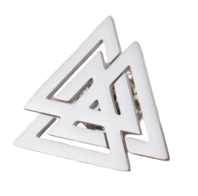 Ein kraftvolles Emblem der Wikinger-Ära im kühlen Silber-Look. Dieser detailreiche Anstecker zeigt den Valknut (Wotansknoten), bestehend aus drei ineinander verschlungenen Dreiecken. Das minimalistische, geometrische Design macht diesen Pin zu einem zeitlosen Accessoire für Liebhaber nordischer Mythologie und historischer Symbolik.