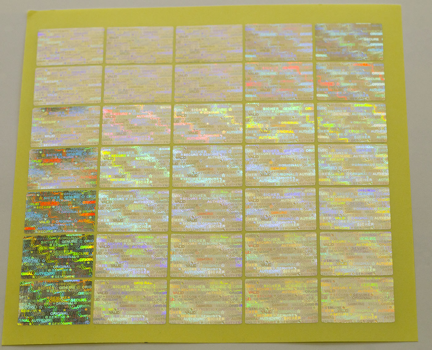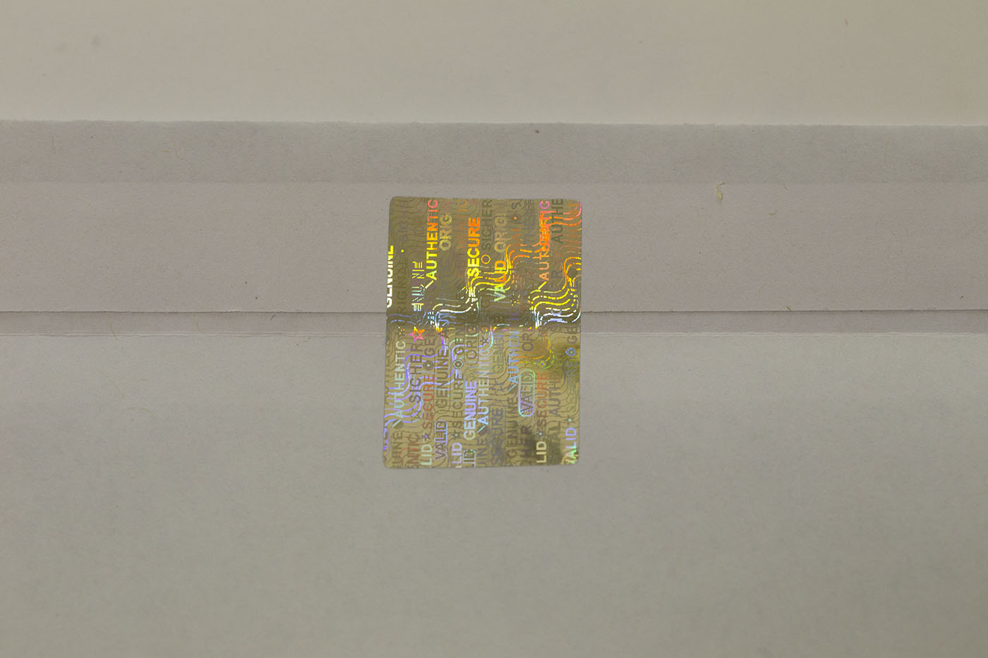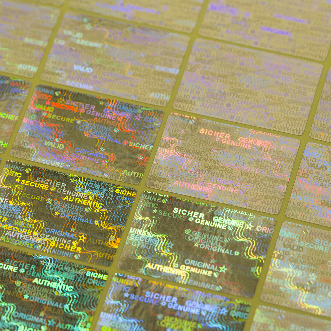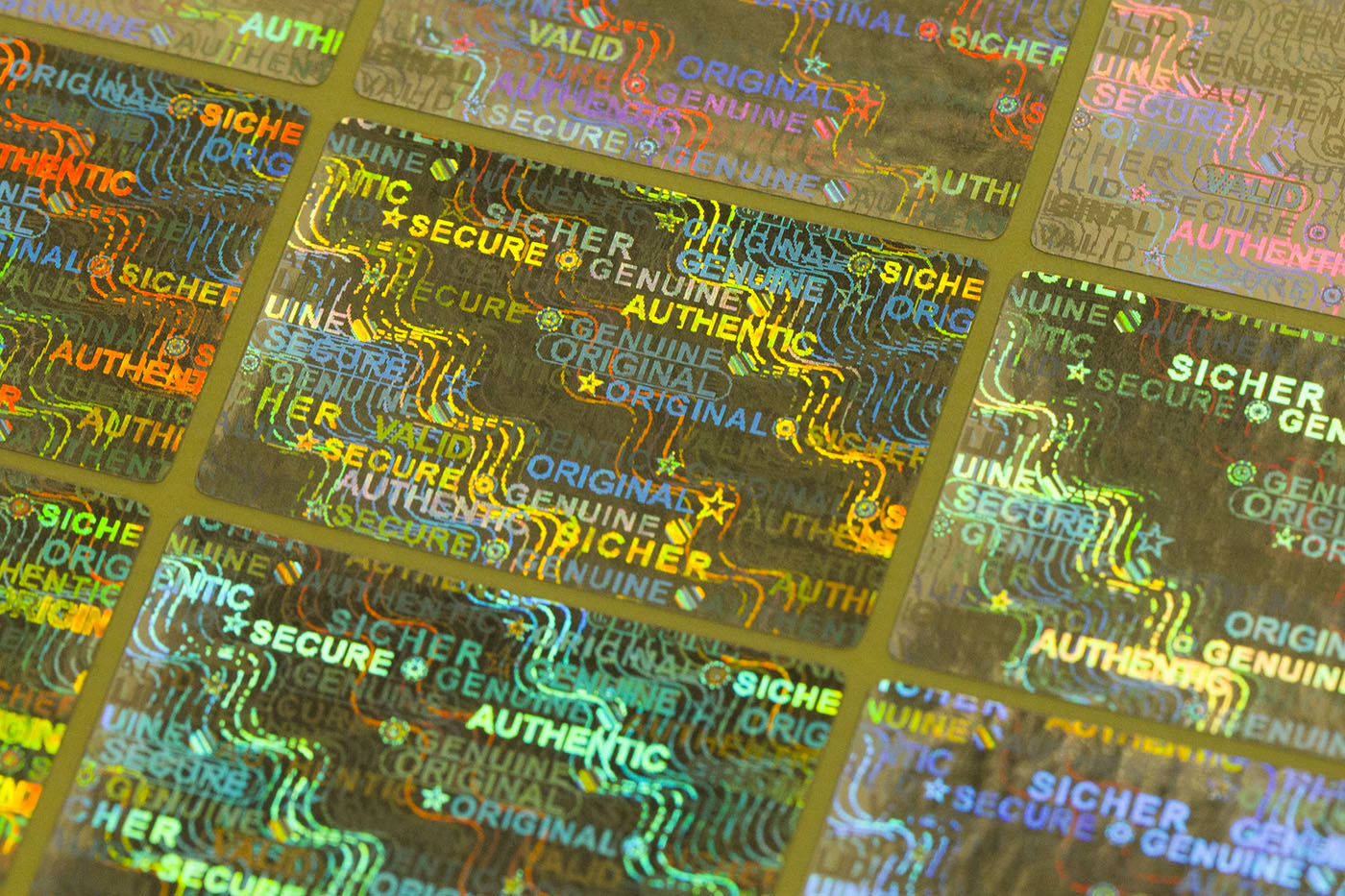 Das Siegel verfügt über eine komplexe Hologramm-Matrix mit Sicherheitsbegriffen wie "Sicher, Genuine, Valid, Authentic, Original, Secure" sowie diversen Mustern und Symbolen.